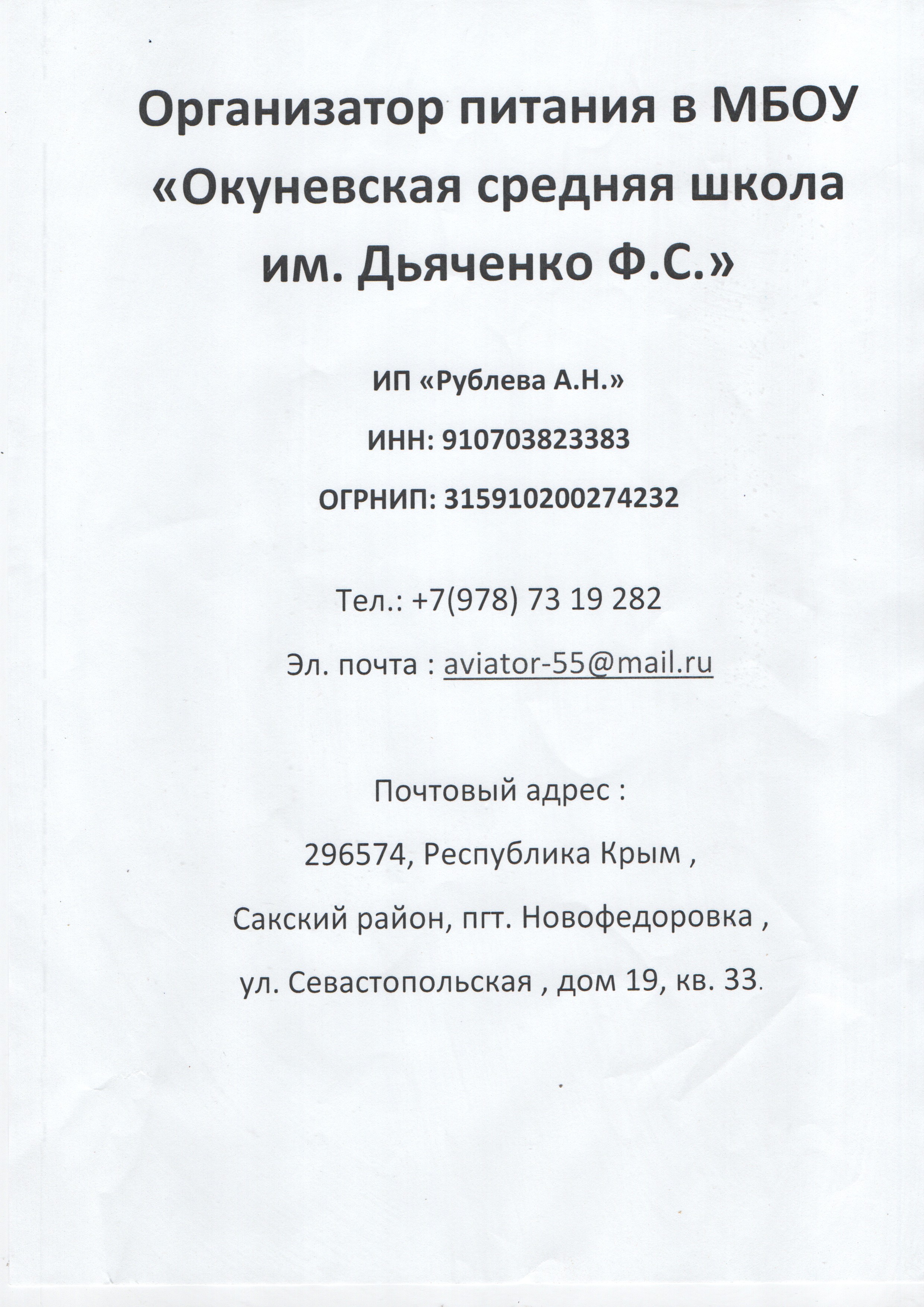 Услуги по организации питания в МБОУ «Новосельская СШ им. И. Жудова» осуществляется Индивидуальным предпринимателем Рублевой Анной Николаевной